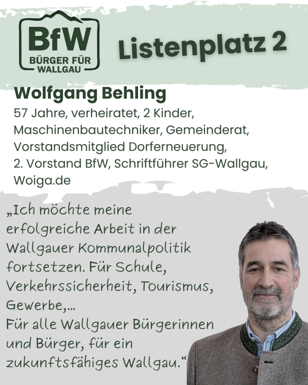 51 Jahre, verheiratet, ein Kind, Bauingenieur, 1. Bürgermeister, Kreisrat, 1. Vorstand BfW, Mitglied Ausschuss: Feuerwehr