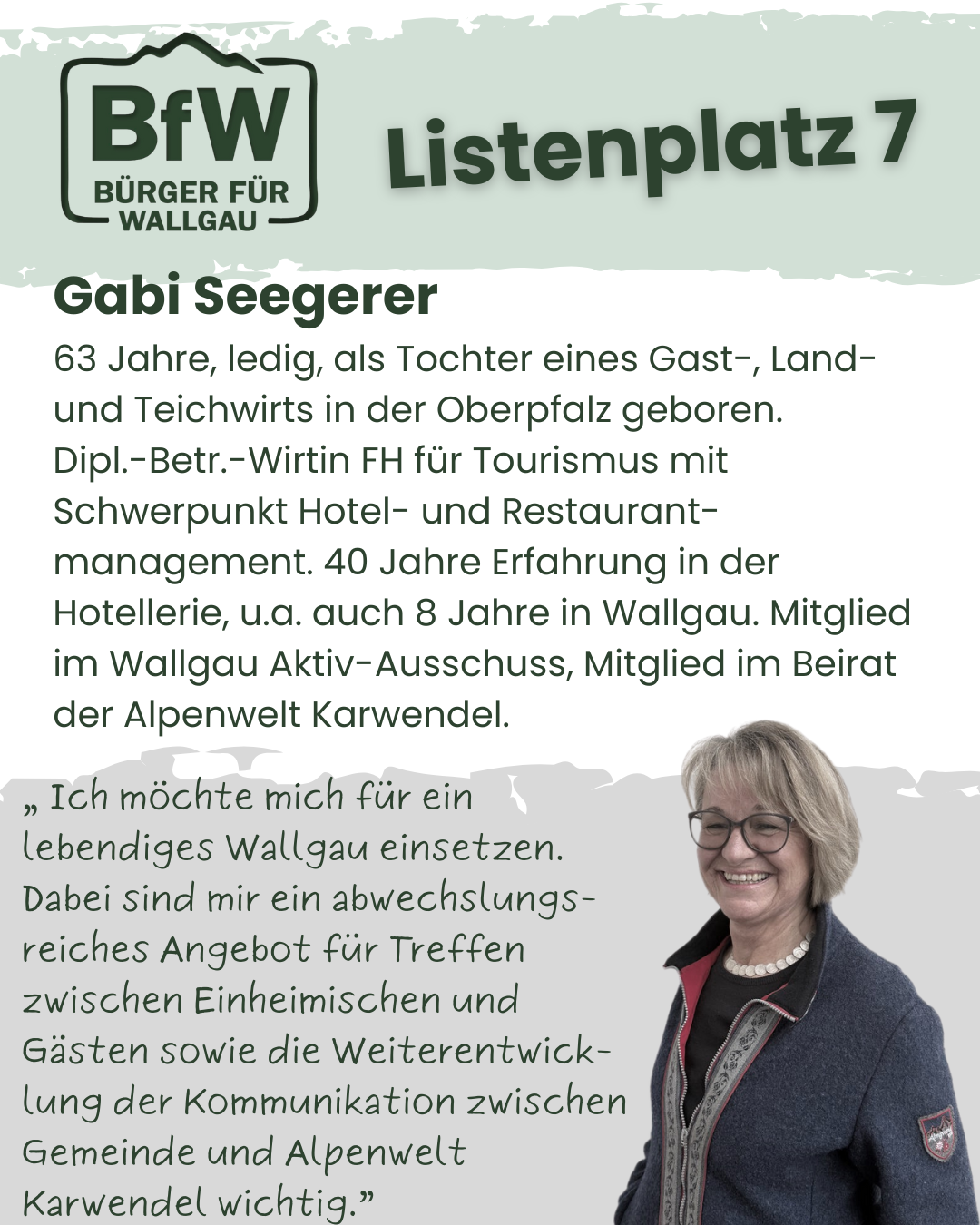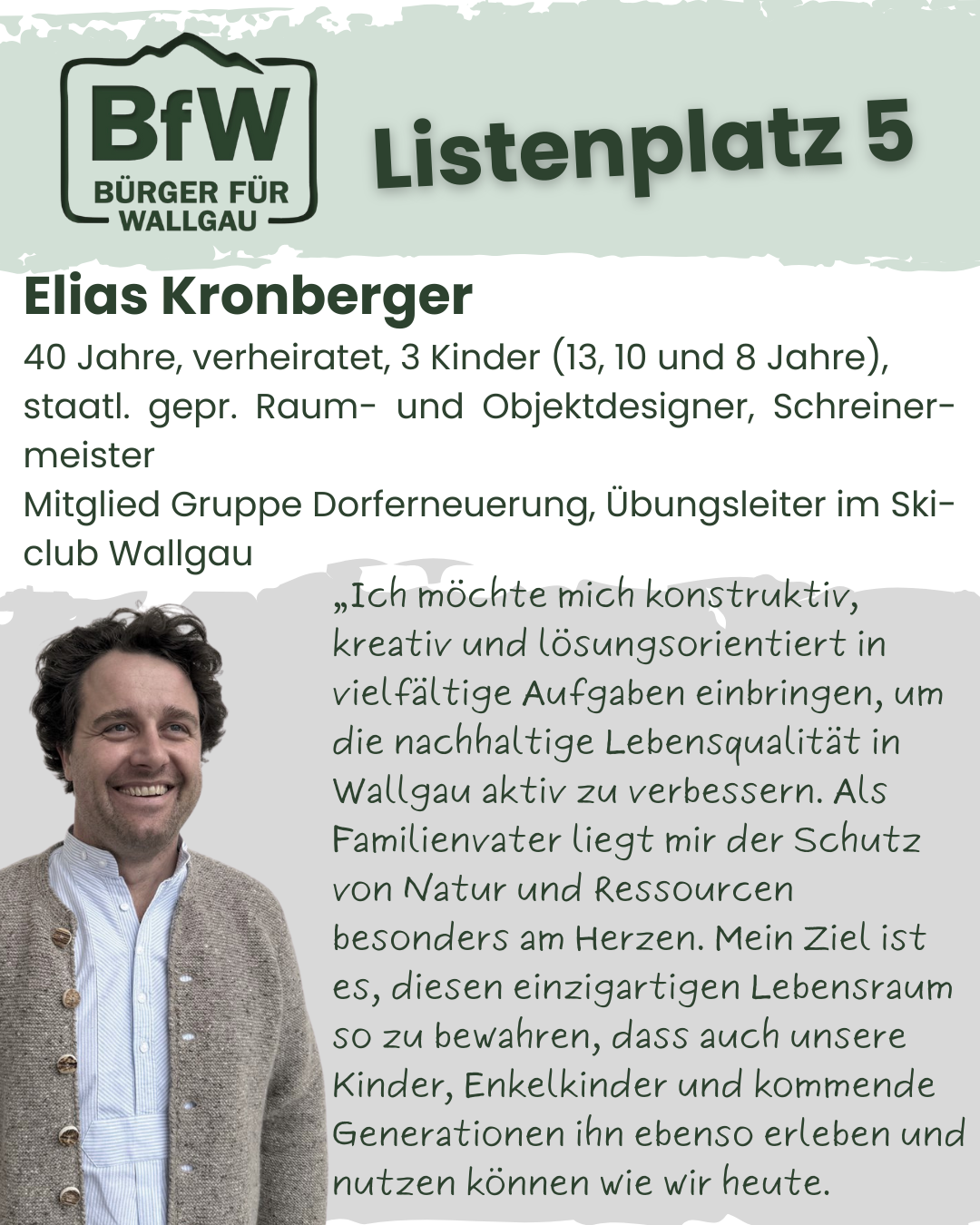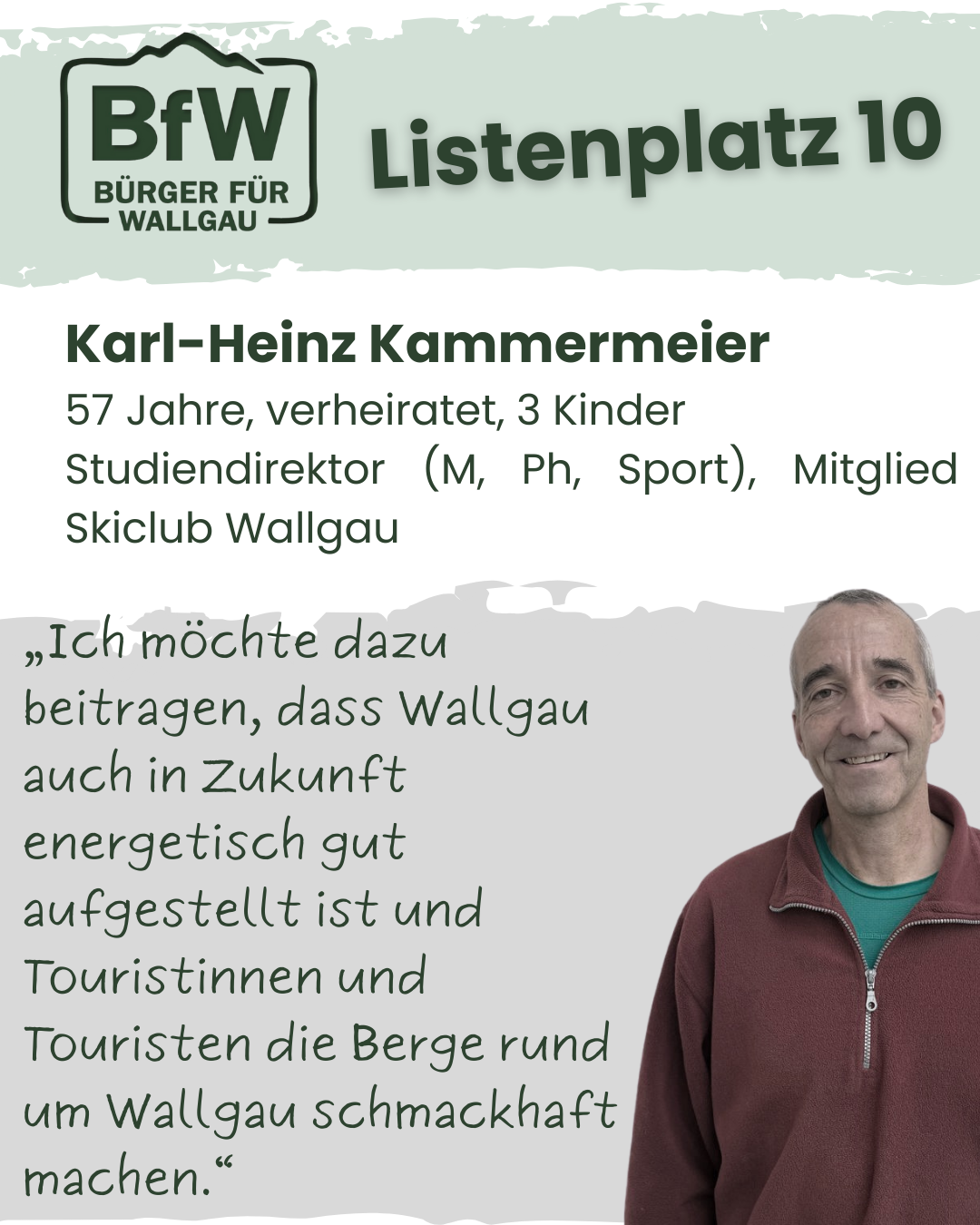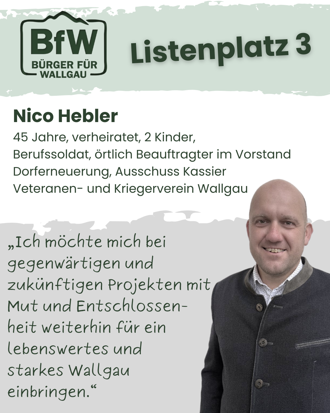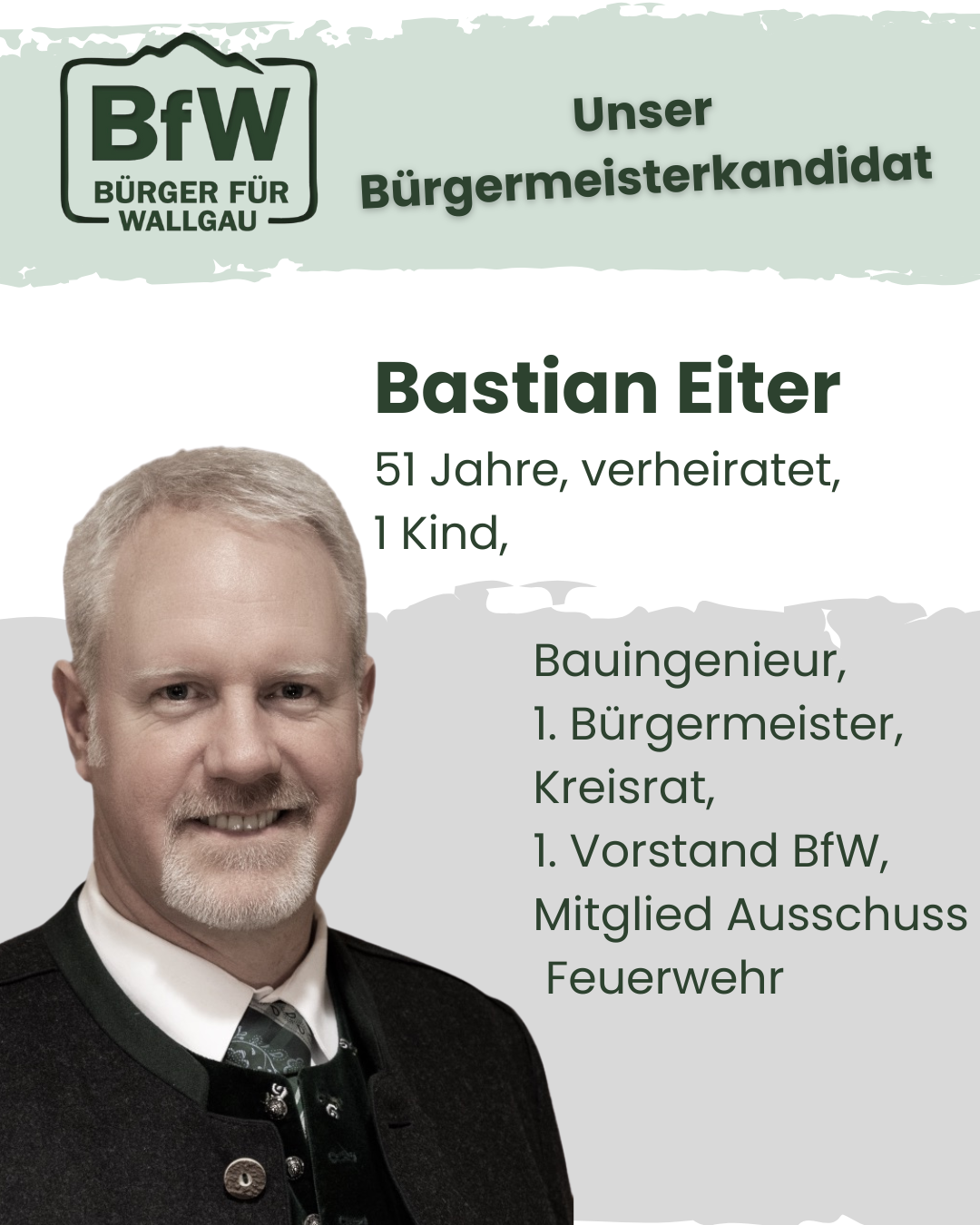 51 Jahre, verheiratet, ein Kind, Bauingenieur, 1. Bürgermeister, Kreisrat, 1. Vorstand BfW, Mitglied Ausschuss: Feuerwehr