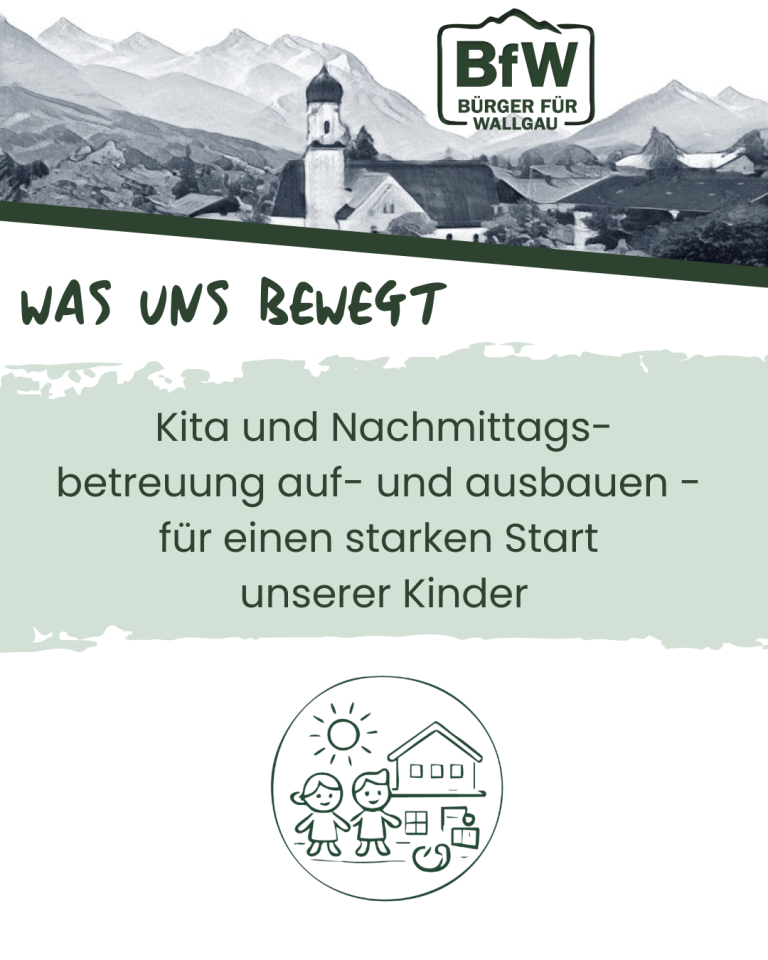 Familien sind das Herz unserer Gemeinde. Damit junge Familien gerne und dauerhaft hier leben, brauchen sie eine verlässliche, qualitativ hochwertige Kinderbetreuung. Wir setzen uns deshalb dafür ein, unsere Kita- und Nachmittagsangebote bedarfsgerecht auf- und auszubauen. Ziel ist es, den Standort Wallgau sowohl für die Kita-Betreuung als auch für den Kindergarten dauerhaft zu erhalten und allen Wallgauer Kindern einen Betreuungsplatz zu ermöglichen – mit ausreichenden Öffnungszeiten, flexiblen Modellen und einer guten pädagogischen Qualität.