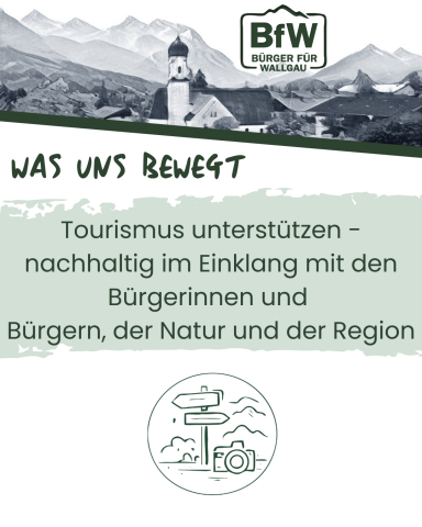 Der Tourismus spielt eine zentrale Rolle in unserer regionalen Wirtschaft und trägt maßgeblich zur Wertschöpfung vor Ort bei. Er stärkt lokale Betriebe und steigert die Attraktivität unseres Ortes. Daher setzen wir uns für mehrere Maßnahmen ein, um den Fremdenverkehr zu stärken. Wir möchten bei der Belebung des gastronomischen Angebots aktiv mitwirken, indem wir unsere Gastronomen bestärken, neue Angebote zu schaffen bzw. bestehende Angebote zu erweitern. Zudem setzen wir uns für eine positive Kommunikation zwischen Gästen und Einheimischen ein, insbesondere zum Schutz der Natur, der Nutztiere und der Landwirtschaft. Wir möchten das gegenseitige Verständnis und die Rücksichtnahme fördern, beispielsweise bei Hundehaltern.