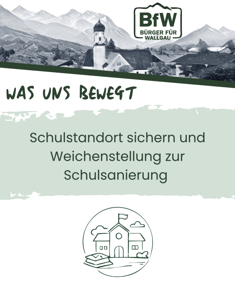Der Erhalt des Schulstandorts in Wallgau ist zentral. Er wirkt sich nicht nur konkret und positiv auf Wallgau in der Gegenwart aus, sondern trägt auch künftig zur Steigerung der Attraktivität unseres Ortes bei. Eine Schule vor Ort steht für kurze Wege, stabile Strukturen und ein vertrautes Umfeld für unsere Kinder. Sie ist ein wichtiger Bestandteil des Dorflebens. Ziel ist es, in der kommenden Wahlperiode den Schulstandort in der Gemeinde Wallgau dauerhaft zu sichern und die dringend notwendige Schulsanierung konsequent voranzubringen. Moderne, gut ausgestattete Klassenzimmer, funktionale Fachräume und ein zeitgemäßes Lernumfeld sollen beste Voraussetzungen für ein erfolgreiches Lernen schaffen. Dabei handeln wir verantwortungsvoll, transparent und in enger Abstimmung mit Schule, Eltern und Gemeinden.
