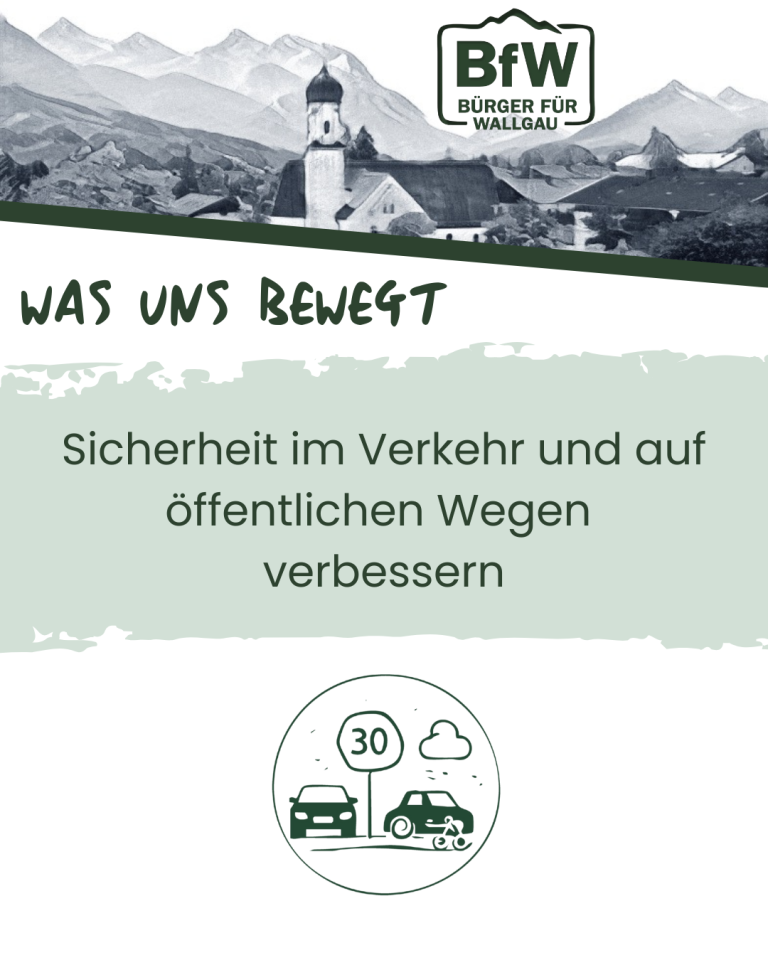Die Straßenführung der B11 durch Wallgau bringt durch die gewachsene Dorfstruktur verschiedene Gefahren mit sich. Wir setzen uns für ein umfassendes Verkehrskonzept ein, um Problemstellen systematisch anzugehen, zu beheben oder zu entschärfen. Unser Ziel ist es, die Sicherheit für alle Verkehrsteilnehmenden deutlich zu erhöhen.
