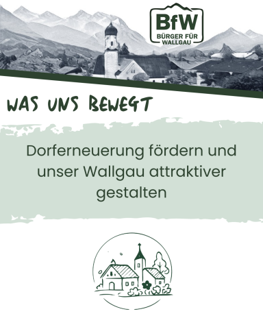 Unser Ziel ist es, die Arbeit in der Dorferneuerung zu unterstützen, weiter bekannt zu machen und ihre Arbeit aktiv zu fördern. Gemeinsam mit den ehrenamtlich Engagierten wollen wir den Dorfplatz und Ortskern in Wallgau gemäß den bestehenden Planungen neugestalten. So entsteht ein zentraler Treffpunkt für alle Generationen, der zum Verweilen einlädt und das Herz unseres Dorfes nachhaltig stärkt.