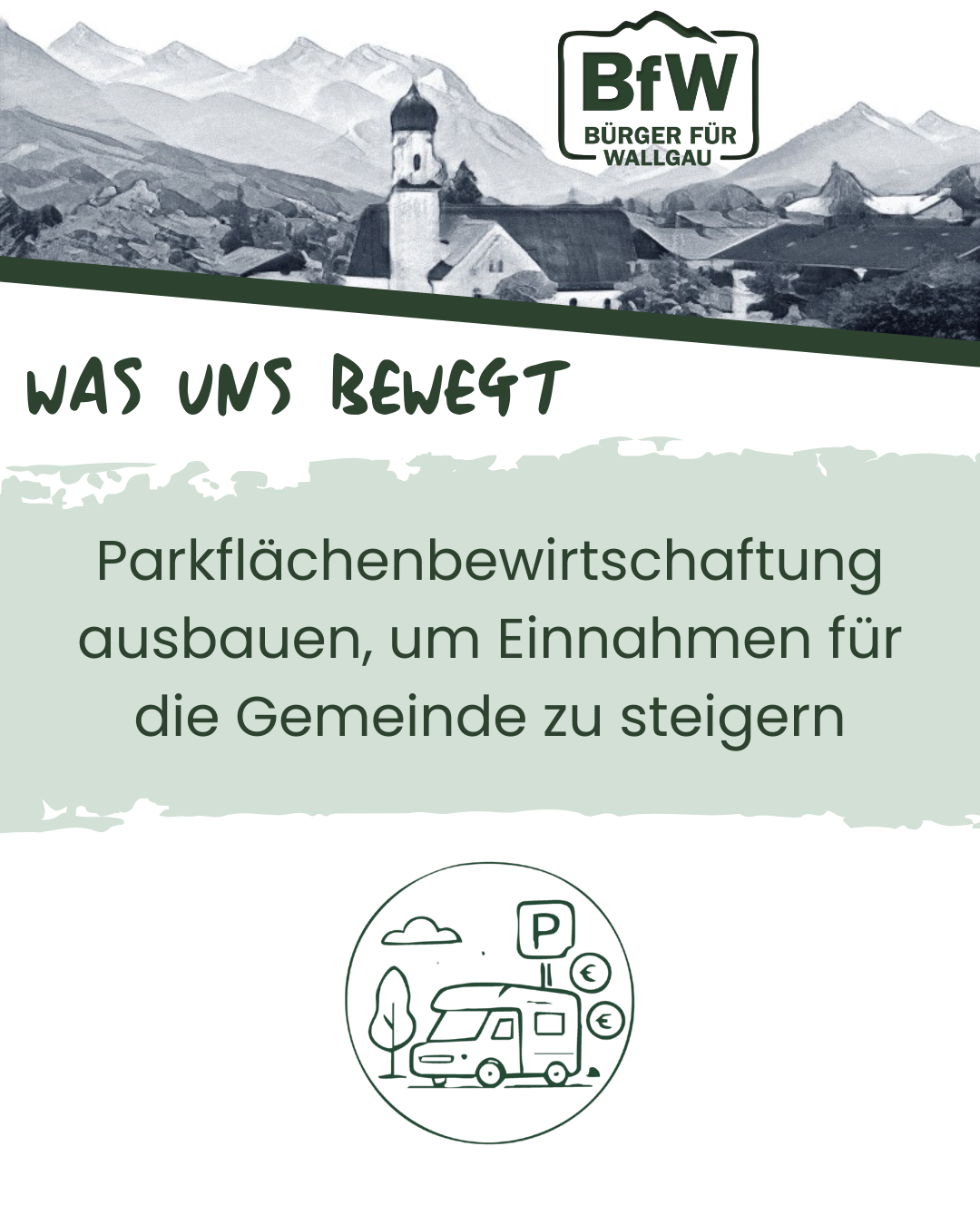Mit überschaubarem Aufwand können klar ausgewiesene Nachtstellplätze geschaffen werden – inklusive Müllentsorgung sowie Wasser- und Abwasserversorgung. Das schafft ein attraktives Angebot und reduziert gleichzeitig das Wildcampen entlang der B11. Jetzt gilt es, vorhandenes Potenzial zu nutzen und die dringend benötigten Einnahmen nicht an der B11 Richtung Walchensee liegen zu lassen. Durch eine durchdachte Parkflächenbewirtschaftung kann Wallgau wirtschaftlich und touristisch profitieren. Lassen Sie uns diese Chance gemeinsam ergreifen, um Wallgau als Destination für durchreisende Wohnmobile zu positionieren und in diese zukunftsorientierte Urlaubsform zu investieren.