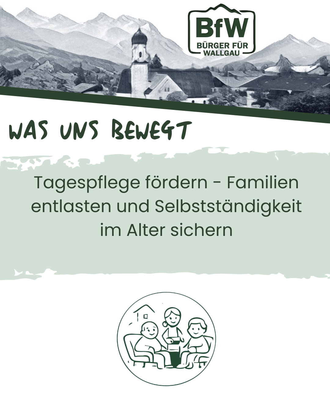 Zusätzlich kann eine Tagespflege, die auch Touristen nach vorheriger Anmeldung eine tageweise Betreuung von Angehörigen ermöglicht, die touristische Attraktivität deutlich steigern. So kann Wallgau eine Vorreiterrolle beim Thema „Urlaub mit pflegebedürftigen Angehörigen" einnehmen. Unser Ziel ist es, konkret mit Trägern in Kontakt zu treten und die Rahmenbedingungen für eine Tagespflege vor Ort zu schaffen. Damit entlasten wir Familien und Angehörige, die Pflege und Beruf miteinander vereinbaren müssen und stärken zugleich die Selbstständigkeit und Lebensqualität im Alter.