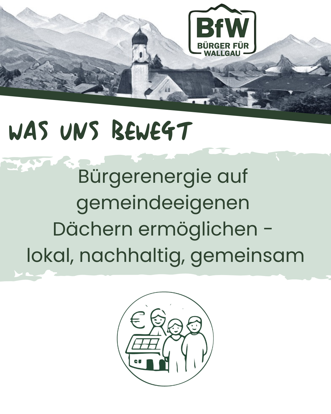 In der Gemeinde Wallgau setzen wir uns mit Nachdruck dafür ein, gemeindeeigene Dächer zur Gewinnung nachhaltiger Energie mithilfe von Photovoltaikanlagen nutzbar zu machen. Es ist von großer Bedeutung, dass die vorhandenen Flächen effizient zur Stromerzeugung genutzt werden können. Gesetzliche Vorgaben dazu werden kommen bzw. sind bereits vorhanden und müssen umgesetzt werden. Um dieses Vorhaben zu realisieren, schlagen wir die Gründung einer lokalen Energieinitiative vor, an der sich alle Bürgerinnen und Bürger Wallgaus beteiligen können. Diese Initiative soll die Finanzierung des Baus und den Betrieb der Photovoltaikanlagen übernehmen. Der produzierte Strom wird anschließend an die Gemeinde verkauft. Eine WinWin-Situation für alle Beteiligten.