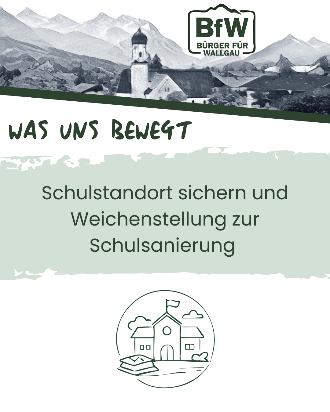 Der Erhalt des Schulstandorts in Wallgau ist zentral. Er wirkt sich nicht nur konkret und positiv auf Wallgau in der Gegenwart aus, sondern trägt auch künftig zur Steigerung der Attraktivität unseres Ortes bei. Eine Schule vor Ort steht für kurze Wege, stabile Strukturen und ein vertrautes Umfeld für unsere Kinder. Sie ist ein wichtiger Bestandteil des Dorflebens. Ziel ist es, in der kommenden Wahlperiode den Schulstandort in der Gemeinde Wallgau dauerhaft zu sichern und die dringend notwendige Schulsanierung konsequent voranzubringen. Moderne, gut ausgestattete Klassenzimmer, funktionale Fachräume und ein zeitgemäßes Lernumfeld sollen beste Voraussetzungen für ein erfolgreiches Lernen schaffen. Dabei handeln wir verantwortungsvoll, transparent und in enger Abstimmung mit Schule, Eltern und Gemeinden.